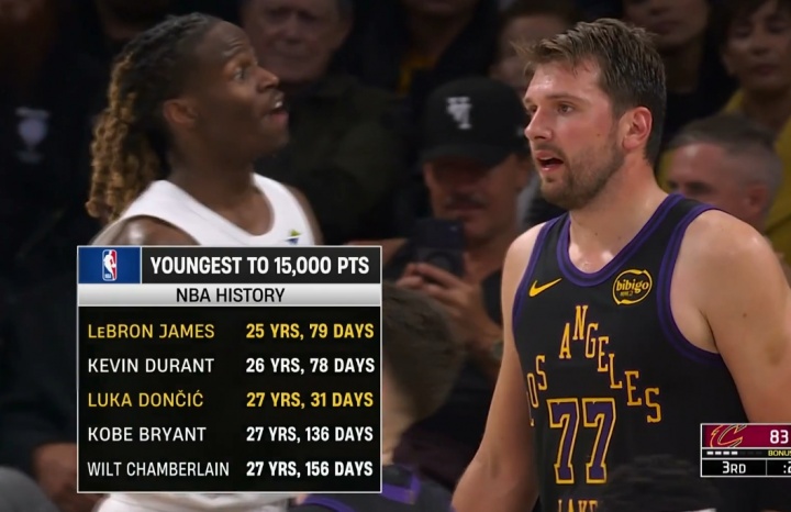 27岁31天的东契奇成为NBA历史第三年轻达成15000分的球员,超越科比(27岁136天),仅次詹姆斯(25岁79天)、杜兰特(26岁78天)。