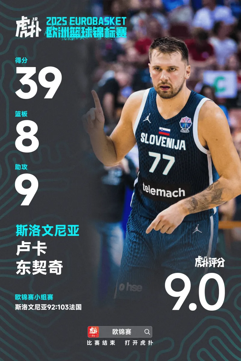 斯洛文尼亚球员卢卡-东契奇出战35分钟,投篮20中8、罚球20中19空砍39分8篮板9助攻2抢断。